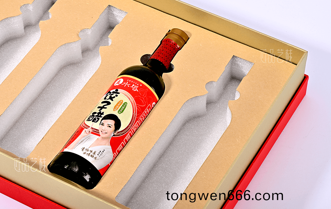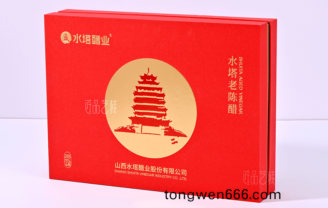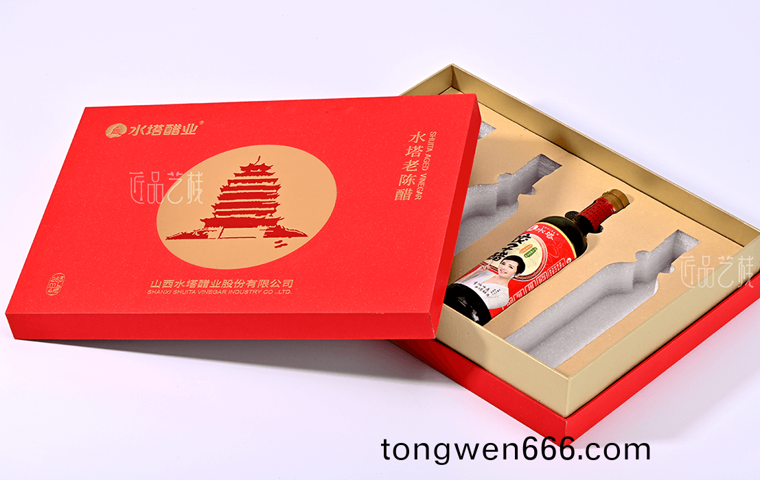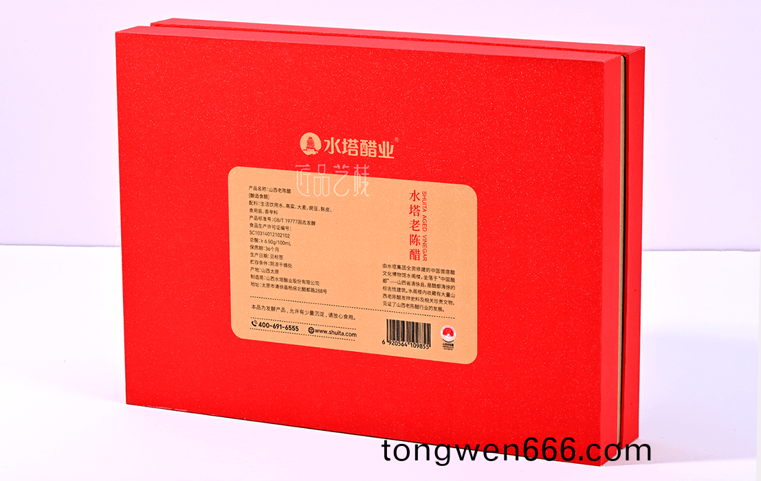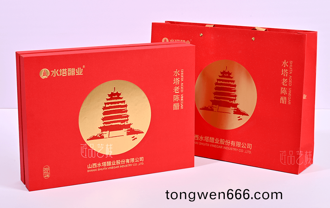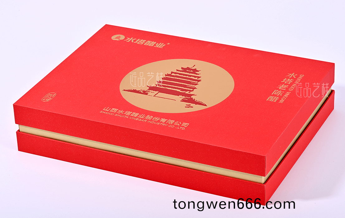 在携手(shou)水塔(ta)醋业礼(li)盒(he)包(bao)装定制中(zhong),采用(yong)天地盖礼(li)盒(he)套(tao)装结(jie)构(gou),